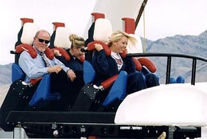 Just before the blood starts to rush entirely into your head you realize that all of your body weight is comfortably held in place by the new innovative lap restraint system, instead of jamming your neck and shoulders up into the bars. Before you know what’s happened, you hit another curve and the car rights itself back up once again... only to zoom off towards yet another plunge over the edge and under it once again.